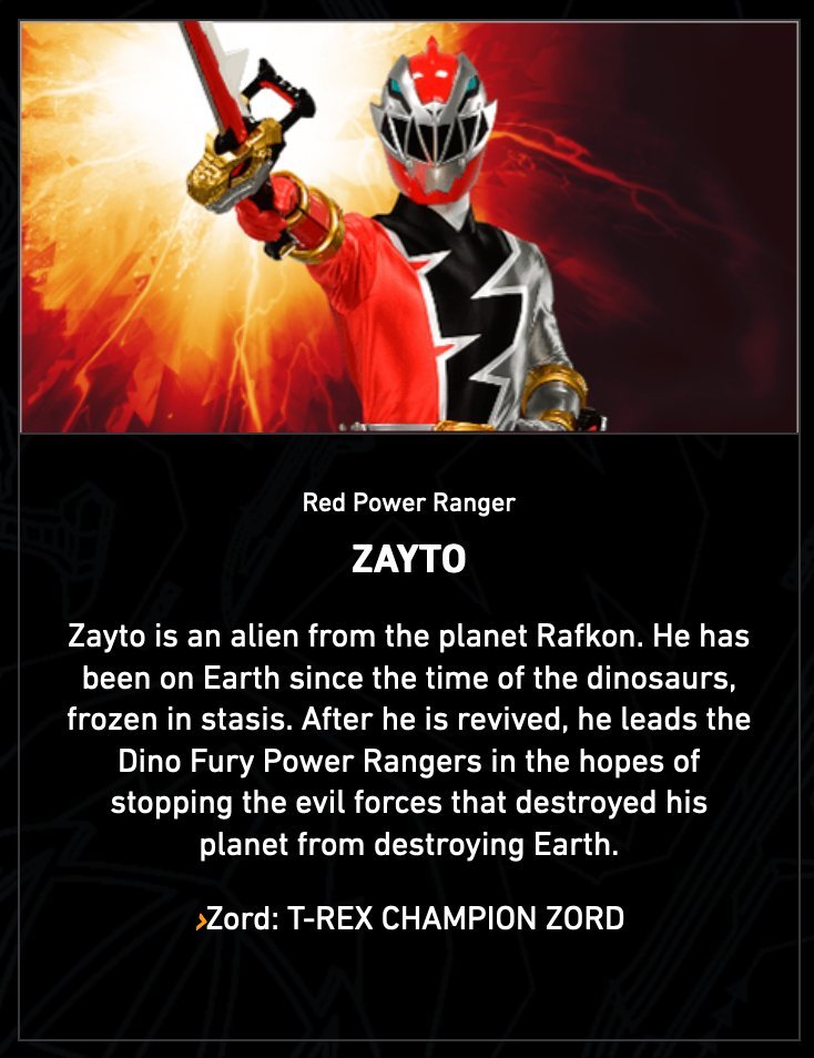 Zayto est un extraterrestre de la planète Rafkon. Il est sur Terre depuis l’époque des dinosaures, gelé en stase. Après son réveil, il commande les Power Rangers Dino Fury dans l’espoir d’arrêter les forces du mal qui ont détruit sa planète de détruire la Terre.