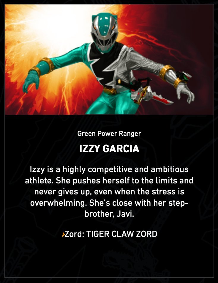 Izzy est une athlète hautement compétitive et ambitieuse. Elle se pousse au-delà de ses limites et n’abandonne jamais, même quand elle est envahie par le stress. Elle est proche de son demi-frère, Javi.