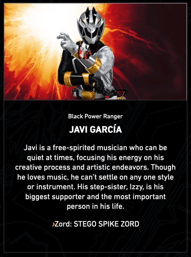 Javi est un musicien à l’esprit libre qui peut parfois être calme, concentrant son énergie dans son procédé créatif et ses activités artistiques. Il adore cependant la musique et ne peut pas se limiter à un seul style ni à un seul instrument. Sa bdemi-soeur, Izzy, est son plus grand soutien et la personne la plus importante dans sa vie.