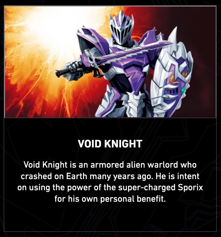 Le Chevalier Void est un Seigneur de guerre extraterrestre en armure qui s’est écrasé sur Terre il y a plusieurs années. Il compte utiliser la puissance des Sporix super-chargés pour son profit personnel.