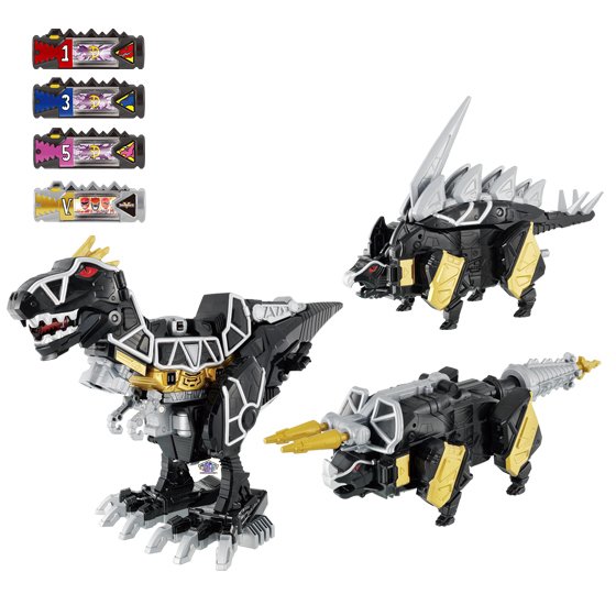 For this « Black Version », named Dark Version, the three Zyudenryu which composes the Kyoryuzin, Gabutyra, Stegotchi and Dricera, are recolored in black, silver and gold. Their Zyudenchi also recolored and are in « Deboth In » mode as was the Zyudenchi of Pteragordon in the series. A fourth Zyudenchi is included, which is a Super Sentai Zyudenchi of Zyuranger, Abaranger and Kyoryuger together.