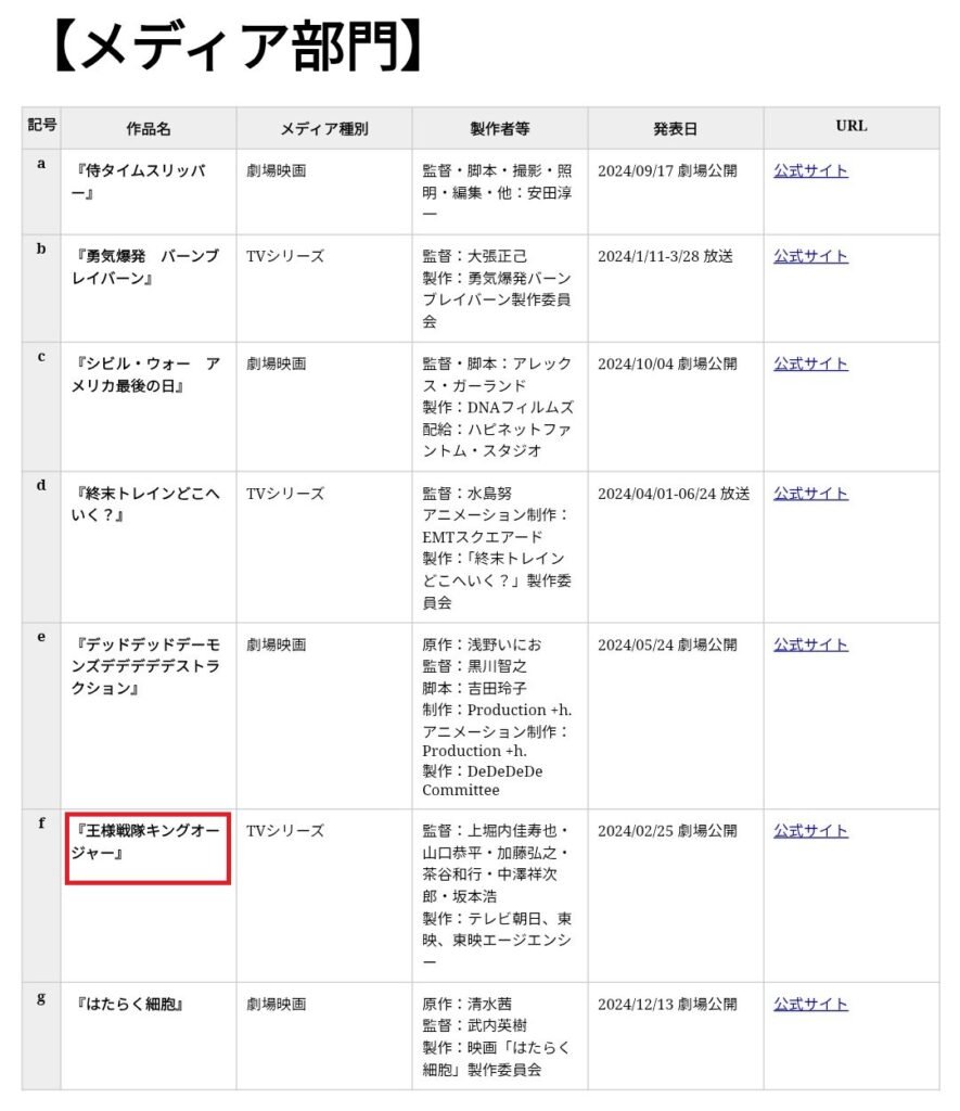 Ohsama Sentai King-Ohger est nominé dans la catégorie « Meilleure œuvre audio-visuelle ».