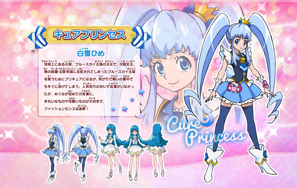 Pour Hime Shirayuki/Cure Princess, nous avons aussi sa forme Precure et ses autres formes Sherbet Ballet et Macadamia Hula-Dance ainsi que ses tenues civile et scolaire :
