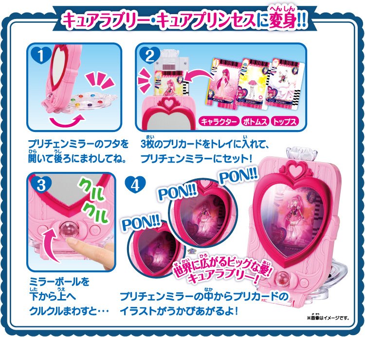 By inserting a trio of superimposed cards in the device, it will pronounce all first « Kawarunrun ! » (~= Euphoric Change !) and then « Precure ! Kururin Mirror Change ! » (~= Precure ! Spinning Mirror Change !). He then pronounce a character roll call sentence if inserted cards are those of the main Precures basic forms but to other forms, it will deliver only their names, preceded by a music related to dance of desired form.