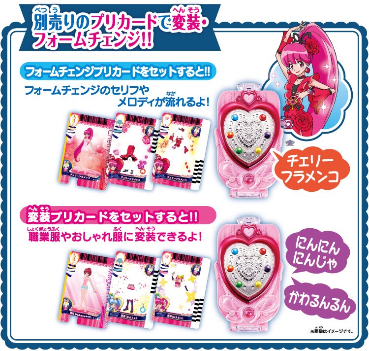 Sur la page d’accueil du site vous pouvez essayer le PreChanMirror, l’appareil de transformation des héroïnes de HappinessCharge. En combinant trois cartes à superposer, le PreChanMirror leur permet de se transformer en Precure, et de changer de forme ensuite. Hors des pouvoirs de Pretty Cure, l’appareil leur permet aussi de revêtir certaines tenues spécifiques comme le faisait déjà l’héroïne Usagi Tsukino/Sailor Moon en civile à l’époque dans sa série.