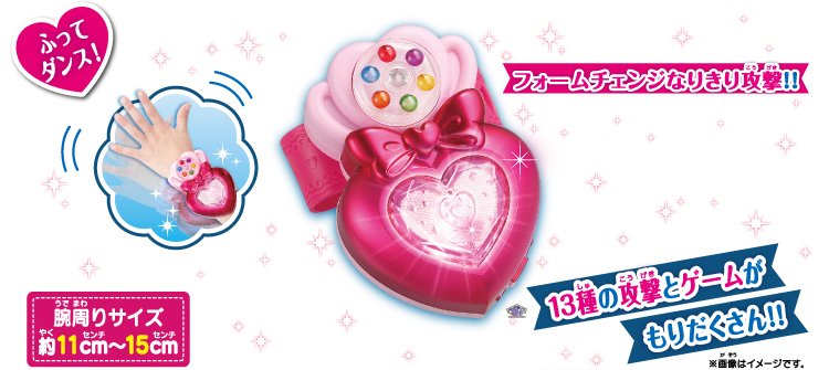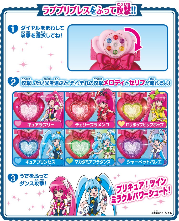 Ces images du LovePreBrace, nous informent un peu plus sur le fonctionnement de l’appareil. Il suffira de tourner la molette pour lancer une attaque qui dépendra selon la couleur de la bille. Les six billes correspondent aux formes principales de Cure Lovely et Cure Princess et de leurs autres formes : Cherry Flamenco et Lollipop Hip-Hop pour Cure Lovely et Macadamia Hula-Dance et Sherbet Ballet pour Cure Princess.