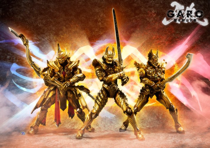 Takeru Jakuzure, aka Enjin Kishi Zen and Aguri Kusugami, aka Tenkyu Kishi Gai, are characters from the GARO ~Yami wo Terasu Mono~. They take on a golden form at the end of the series, giving them more power.