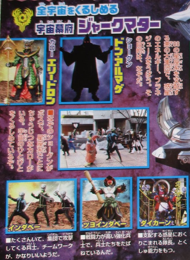 Les soldats (en bas à gauche) s’appellent les Indaver. Il en existe de plus puissants appelés Tsuyoindaver (en bas au milieu). Les soldats de haut rang (les « monstres de la semaine ») sont des Daikarn. Le premier (en bas à droite) s’appelle Gamettsui. Le rôle d’un Daikarn est de protéger une planète conquise par Jark Matter.